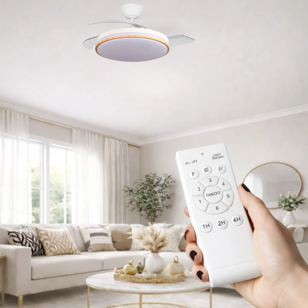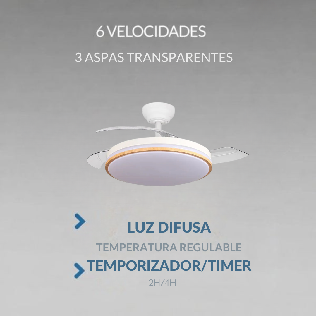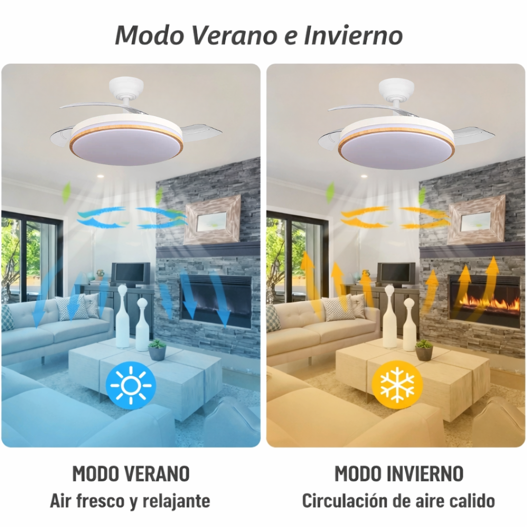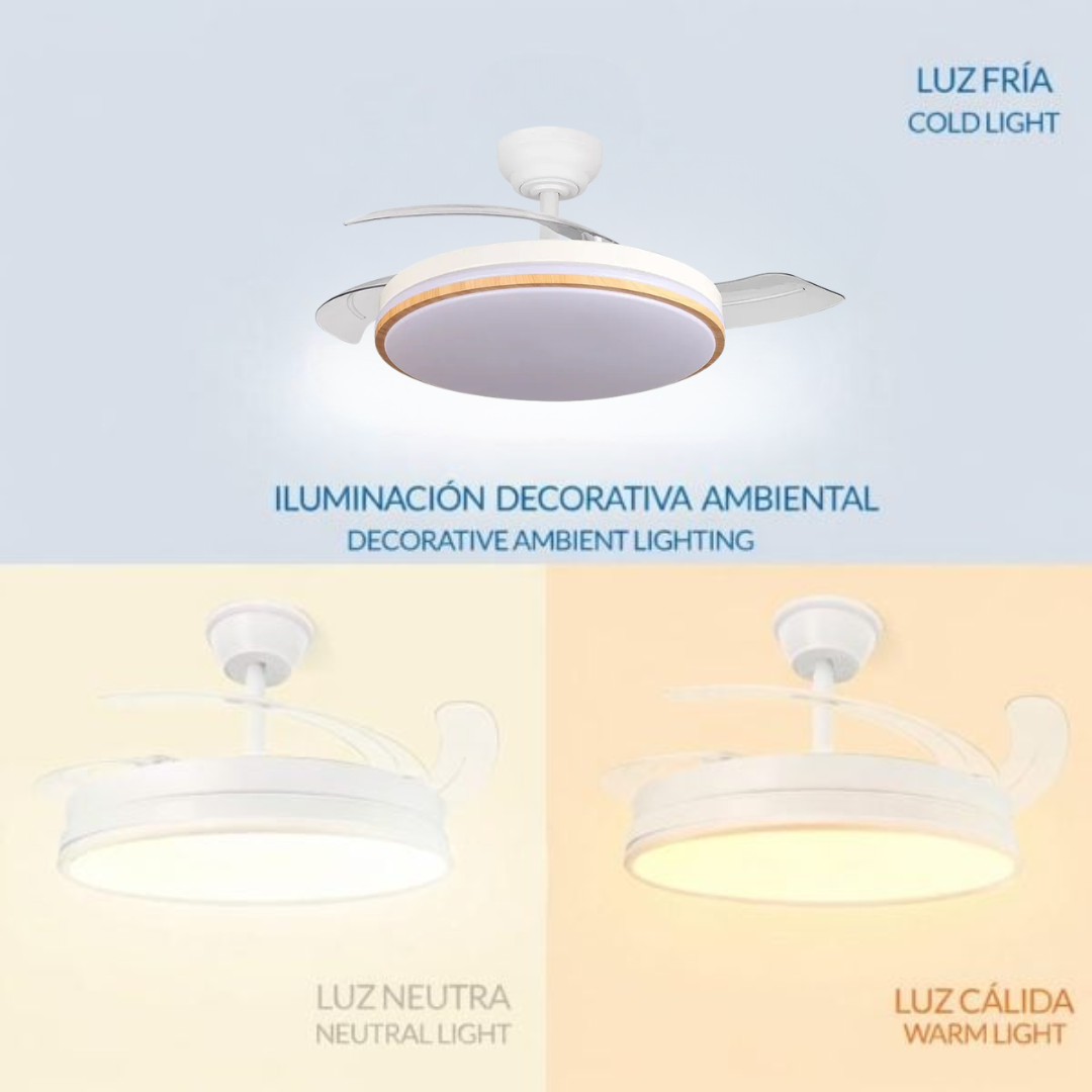 Ventilador de techo con luz, Control por VOZ silencioso, con motor DC 60W, ø107 cm, aspas Retractiles, 6 velocidades, temporizador, función verano-invierno y mando a distancia.